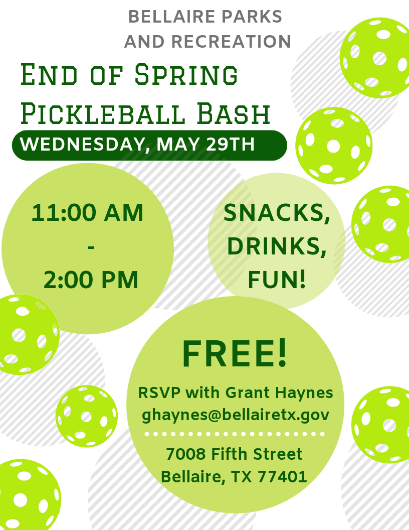 Come to the Bellaire Recreation Center for free Pickle Ball games, snacks, and drinks. This is a great opportunity to meet other Pickle Ball players in the Houston area!