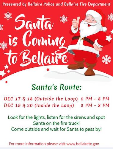 Sources from the North Pole are predicting that Santa will be back in Bellaire one more time before Christmas. The happy elves have reported that he will be riding atop a fire truck on your street to wave hello and wish you all good cheer!