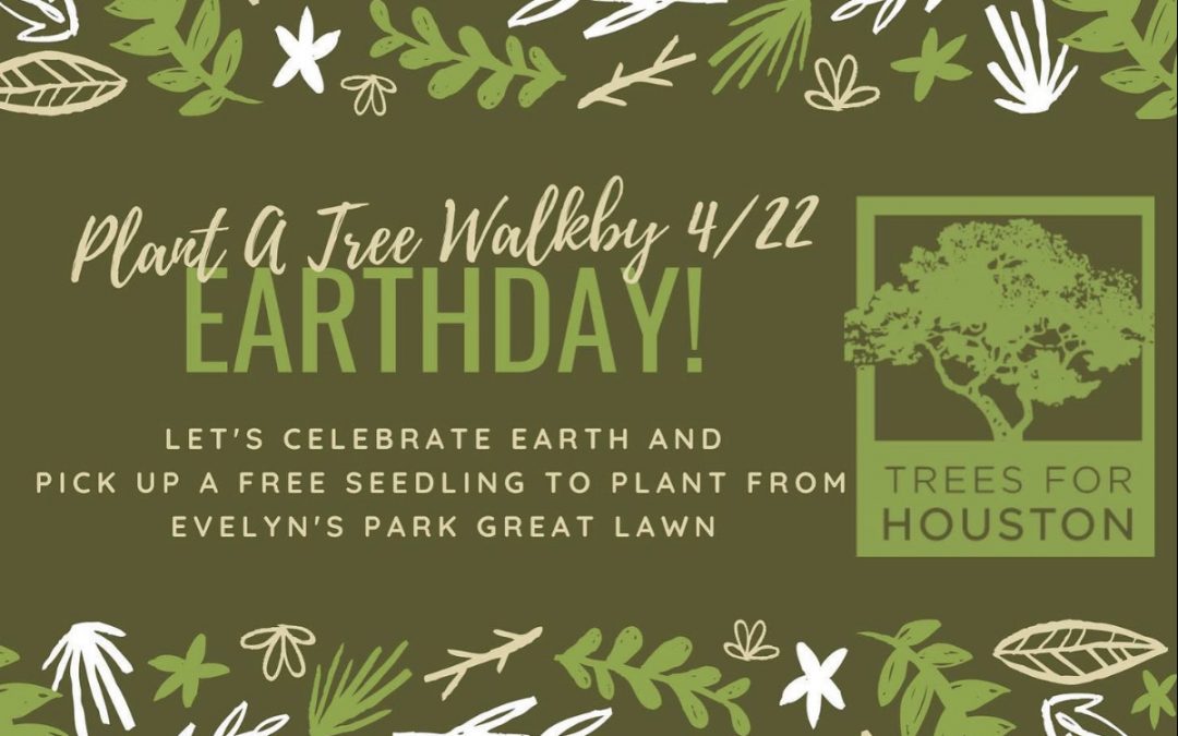“Earth Day Plant A Tree Walk By”!!! Trees for Houston will be donating free tree seedlings at Evelyn’s Park great lawn for you to take home and plant on Wednesday 4/22 while supplies last (one per family). Tree planting is a fun activity for your family to do on Earth Day giving back to our community and environment.