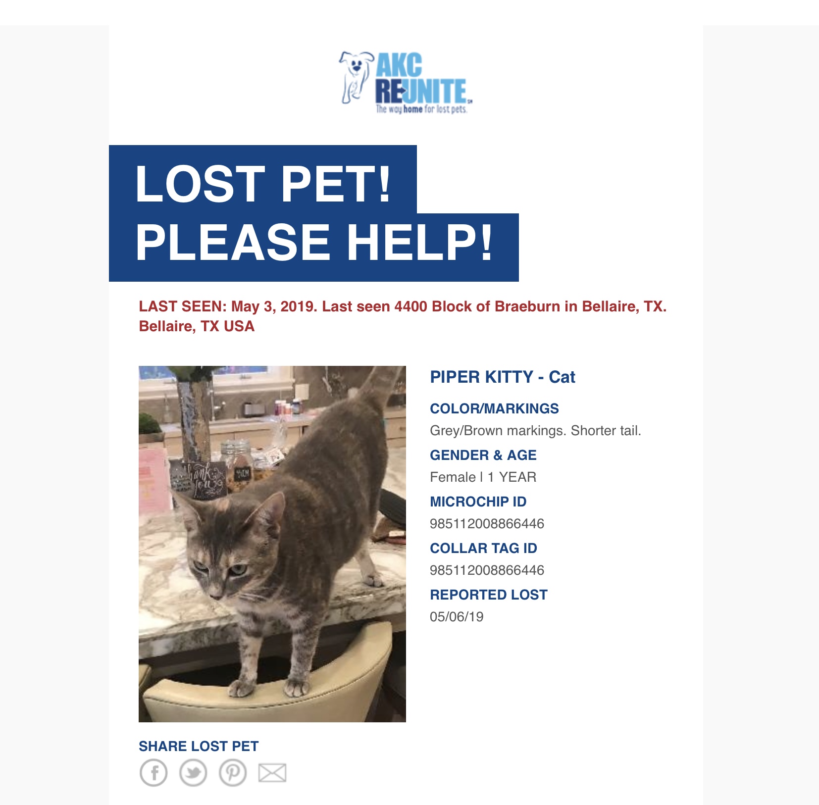 BellaireConnect posted a new topic "Cat lost on 5/3" – 6 years, 6 months ago